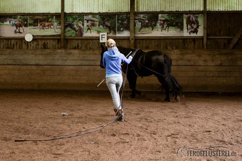 Eine Besonderheit im System von Laura ist, dass sie die Leinen am Boden mitschleifen lässt. Das ist wohl eher unüblich und es gibt auch Kritiker dieser Methode, die befürchten, dass man sich mit den Füßen in der Doppellonge verheddern kann.