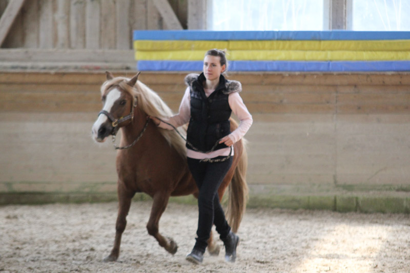 - Für den Aufbau erst einmal eine Stange auf den Boden legen und damit in Schritt und Trab mit dem Pferd Seite an Seite drüber laufen
