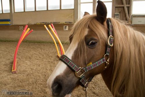 Pferdeflüsterei: Okay, das geht ja als Anforderung, das sollten die meisten doch hinbekommen ;-) Jetzt lernen ja Pferde oft beim Reiten oder bei der Bodenarbeit oder eben auch beim Führen, dass sie dem Druck weichen sollen. Beim Horse Agility gibt’s Hindernisse, bei denen sie gegen den Druck gehen müssen – wie bei den Schwimmnudeln zum Beispiel – was sagst du zu dem Gedanken, dass das die Pferde doch verwirren könnte?
