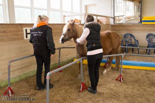 Eine Kursteilnehmerin macht Anfangs zum Beispiel zu viel mit der Hand. Ihre Energie treibt ihr Pferd erst einmal weg. Beim zweiten Versuch macht sie weniger und schon funktioniert es. Da es sich auch um Freestyle Horse Agility handelt – kann es auch mal passieren, dass der Teilnehmer dem Pferd zum Abschied hinterherwinkt.
