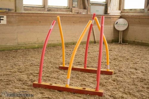 Du legst zwei Gassen nebeneinander auf den Boden. Erst breiter, dann nach und nach enger gestellt, bis sie bei Hufschlagbreite angekommen ist. Erst wenn das Pferd flüssig durch die Gassen kommt, darf es zum Beispiel auf Stege und andere höhere Hindernisse.
