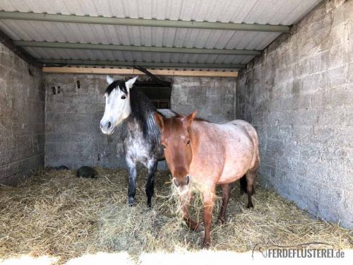 Deswegen haben wir nach einer Lösung gesucht und den Laufstall Nachts einfach zweigeteilt. Wir gliederten die beiden sozusagen im Laufstall langsam ein. Wie bei einer Herdeneingliederung. Tagsüber standen sie friedlich zusammen auf ihrem Paddock oder im Sommer in der größeren Gruppe auf der Sommerkoppel und Nachts bekamen sie eine Trennung.