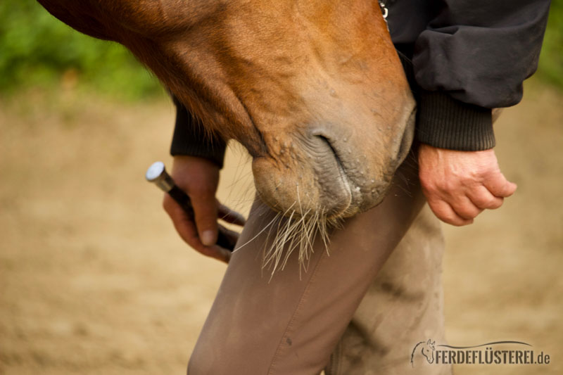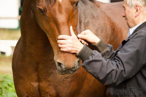 - Er gibt mit der einen Hand Druck mit beiden Fingern auf die Nase und streichelt das Pferd gleichzeitig mit der anderen Hand am Kinn