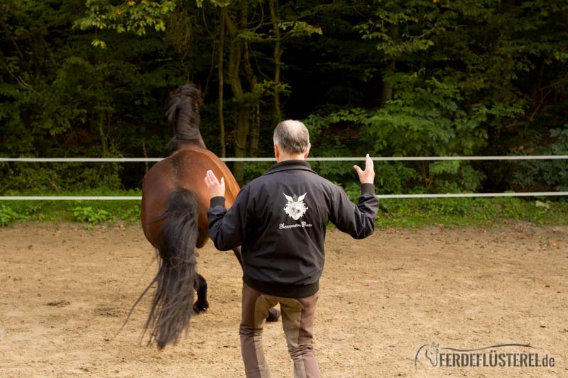 Wolfgang Marlie: Bedrängen bedeutet, dem Pferd eine Unbehaglichkeit zuzumuten, die es veranlasst aus seiner vermeintlichen Komfortzone zu gehen. Ich möchte Pferde auf Signale konditionieren. Ich möchte, dass das Pferd lernt, über seine Sinne meine Signale wahrnehmen zu können. Das kann eine Berührung sein oder etwas, was ich ihm zeige oder was ich akustisch von mir gebe.